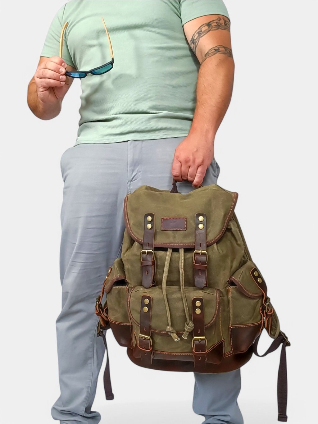 Pánsky turistický batoh ARMY 25 L z voskovaného plátna a kože