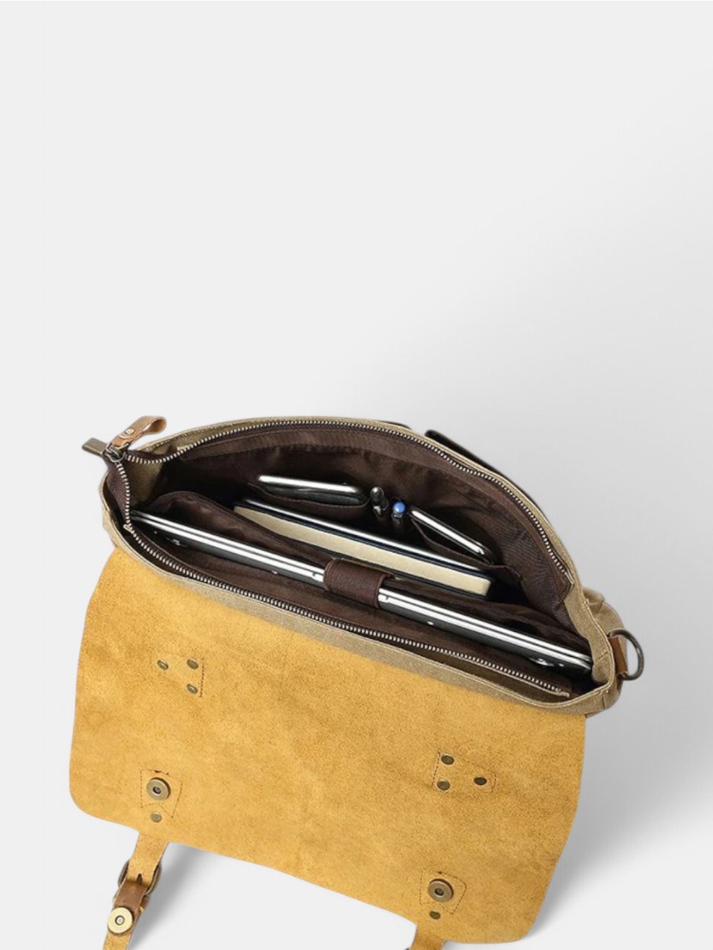 Hnedá pánska taška na notebook z kombinácie pevného bavlneného plátna a pravej hovädzej kože je navrhnutá tak, aby bezpečne chránila váš 14-palcový notebook, doklady aj osobné drobnosti a pritom pôsobila nadčasovo a elegantne. Precízne kožené detaily a robustné kovové zipsy jej dávajú autentický vintage charakter, ktorý sa hodí do každého pracovného aj mestského prostredia.