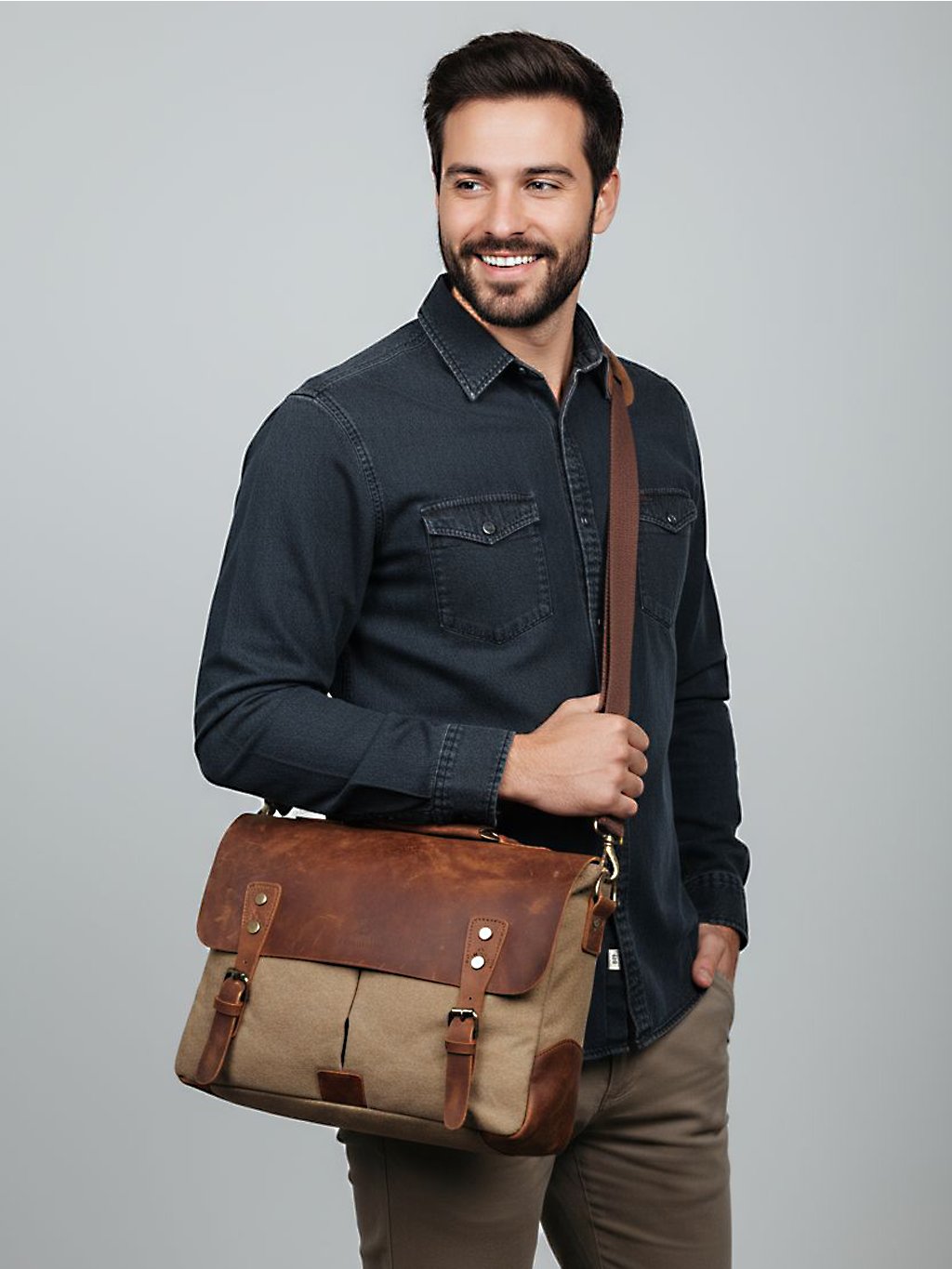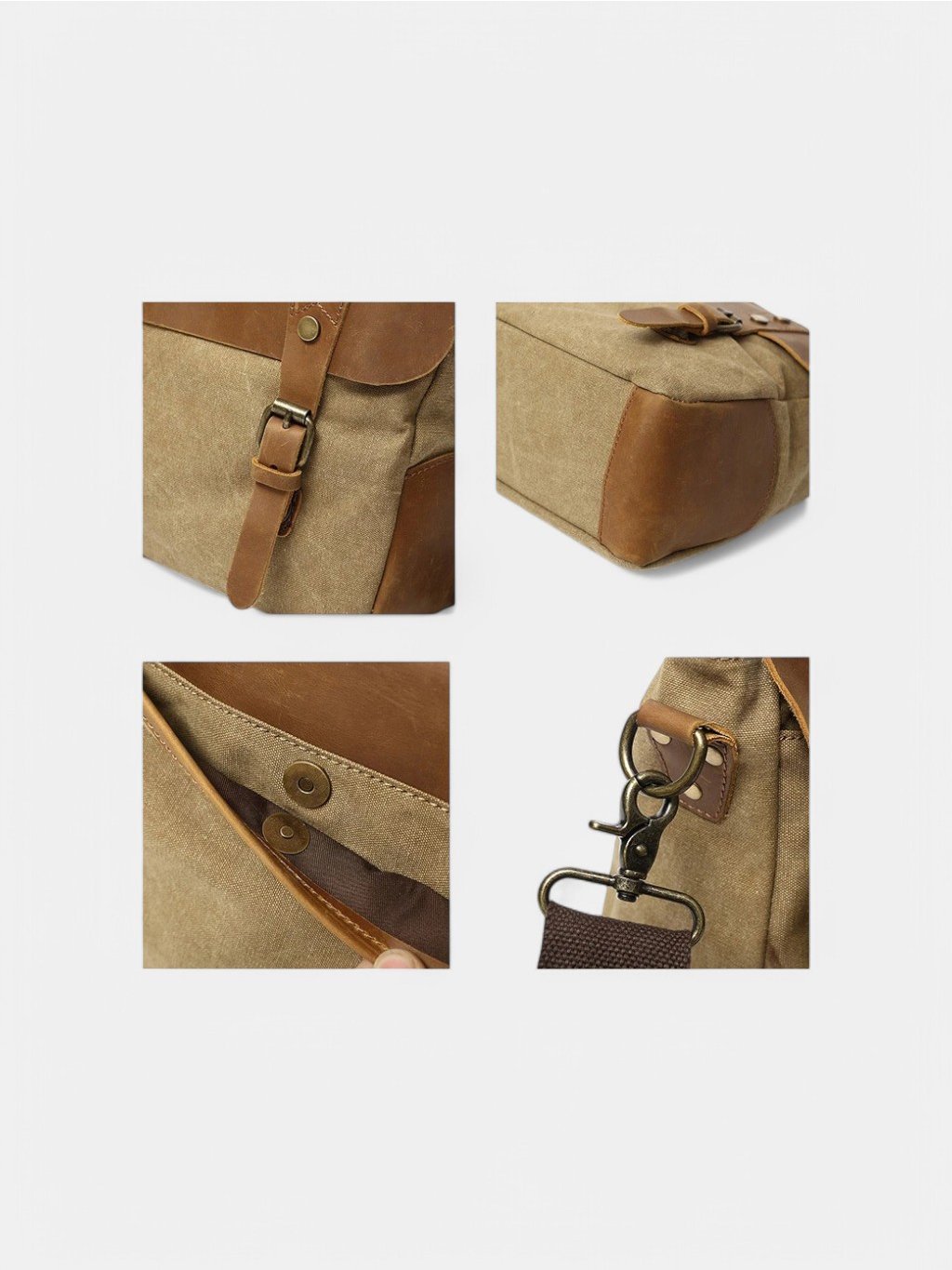 - Prémiové materiály: Kombinácia odolného bavlneného plátna a pravej plnozrnnej hovädzej kože, ktorá časom získava unikátnu patinu.