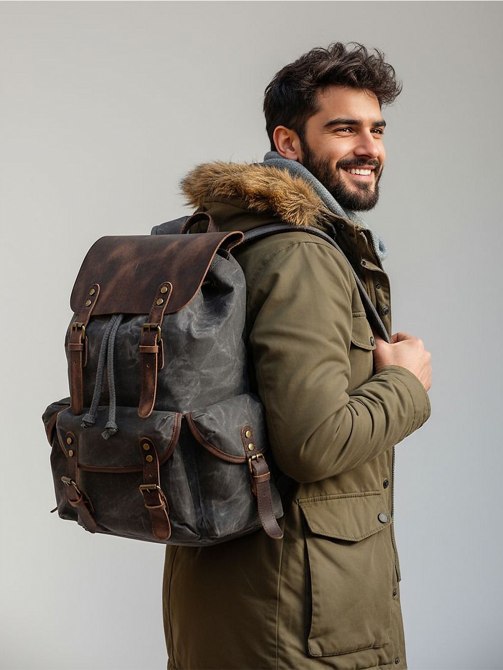 Pánsky turistický batoh je vyrobený z vysokokvalitného nepremokavého bavlneného plátna, ktorý zabezpečuje ochranu obsahu pred dažďom a vlhkosťou. Elegantný šedý dizajn batohu je doplnený o štýlové kožené detaily, ktoré dodávajú batohu nádych luxusu a sofistikovanosti. Sú nielen estetické, ale aj funkčné a poskytujú praktické vrecká a úchyty. Robustné kovové prvky sú zárukou, že batoh bude slúžiť po dlhé roky.